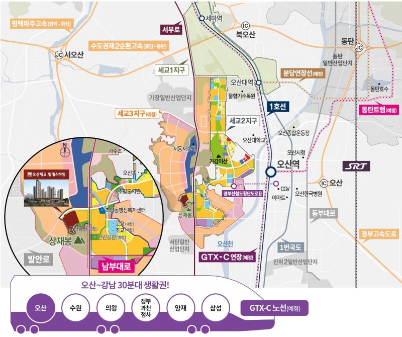 오산시는 수도권 남부의 교통 허브로서 점진적인 개발이 진행 중입니다. 수원, 용인, 평택과 인접한 지리적 이점을 갖고 있으며, 경기남부 주거수요가 꾸준히 유입되고 있습니다. 세교신도시는 이러한 개발 전략의 핵심으로, 지속적인 인프라 조성이 예정되어 있습니다.